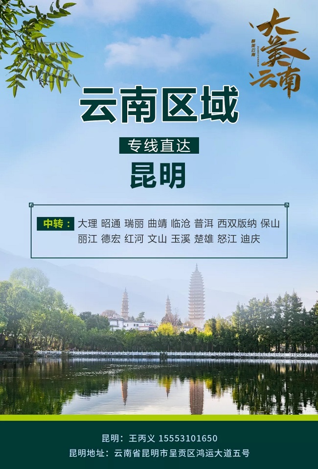 中轉(zhuǎn):大理、昭通、瑞麗、曲靖、臨滄、普洱、西雙版納、保山、麗江、德宏、紅河、文山、玉溪、楚雄、怒江、迪慶