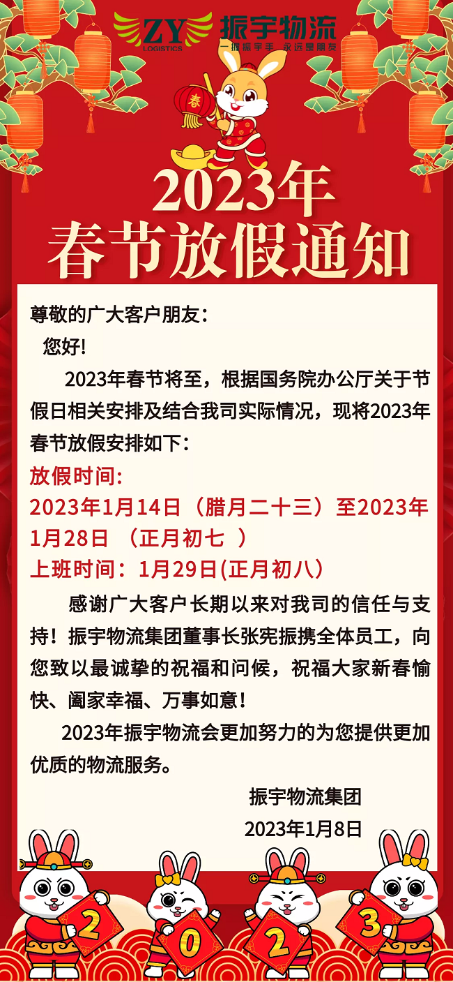 感謝廣大客戶長期以來對我司的信任與支持!振宇物流集團董事長張憲振攜全體員工,向您致以最誠摯的祝福和問候,祝福大家新春愉快、闔家幸福、萬事如意!