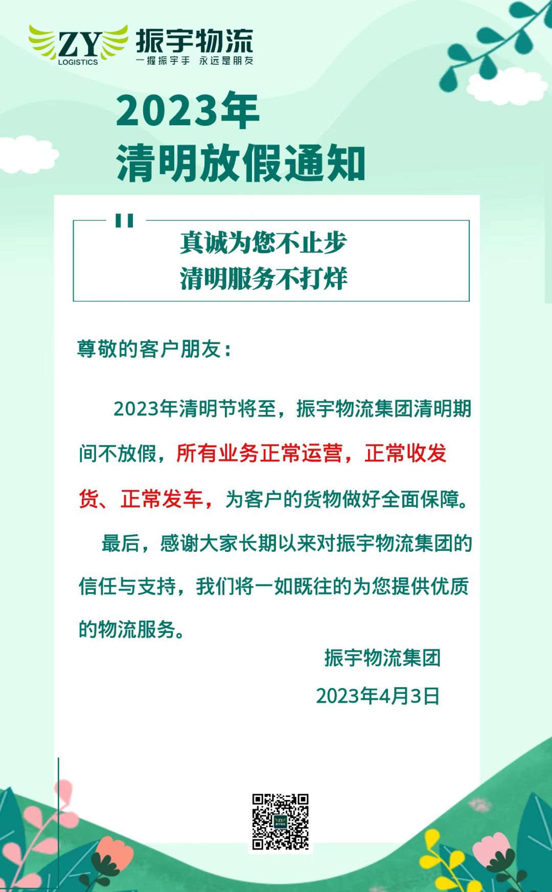 2023年清明節(jié)將至,振宇物流集團清明期間不放假,所有業(yè)務正常運營,正常收發(fā)貨、正常發(fā)車,為客戶的貨物做好全面保障。最后,感謝大家長期以來對振宇物流集團的信任與支持,在此祝您度過一個愉快的假期。