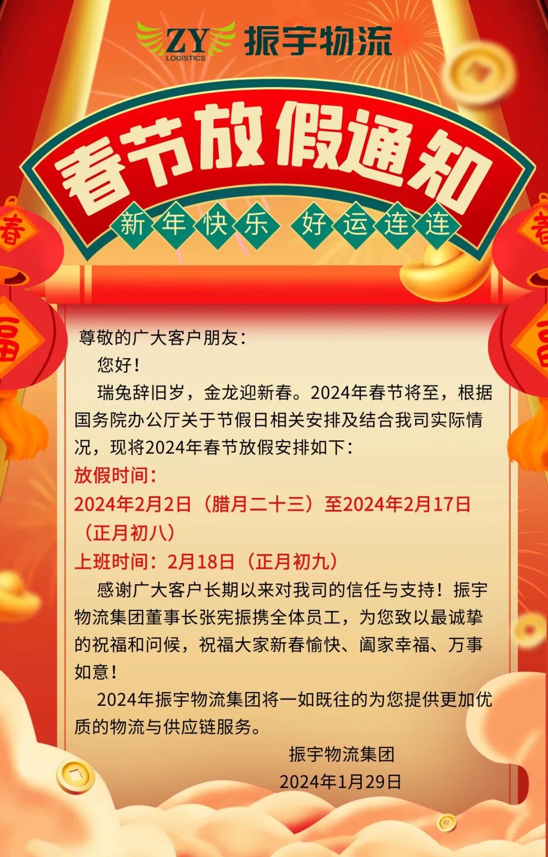 振宇物流集團(tuán)丨2024年春節(jié)放假通知