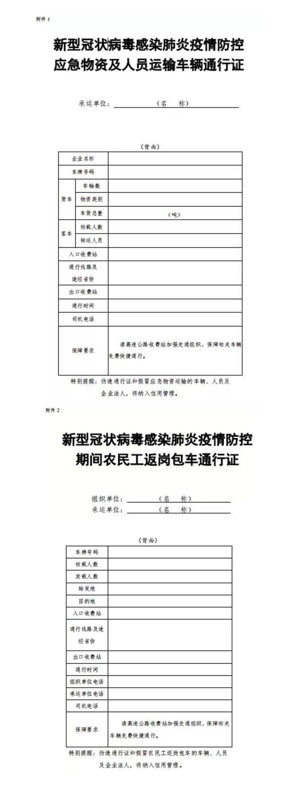 通知要求,地方各級(jí)交通運(yùn)輸部門要認(rèn)真落實(shí)《交通運(yùn)輸部關(guān)于切實(shí)保障疫情防控應(yīng)急物資運(yùn)輸車輛順暢通行的緊急通知》和《交通運(yùn)輸部關(guān)于疫情防控期間免收農(nóng)民工返崗包車公路通行費(fèi)的通知》要求,切實(shí)簡(jiǎn)化“新型冠狀病毒感染肺炎疫情防控應(yīng)急物資及人員運(yùn)輸車輛通行證”(簡(jiǎn)稱“車輛通行證”)、“新型冠狀病毒感染肺炎疫情防控期間農(nóng)民工返崗包車通行證”(簡(jiǎn)稱“包車通行證”)辦理流程,通過政府網(wǎng)站、微信、電子郵件等便捷方式提供“車輛通行證”“包車通行證”統(tǒng)一式樣,供承運(yùn)單位或駕駛?cè)嗽诒镜刈孕写蛴?、自行填寫?/span>