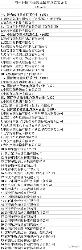 按照運(yùn)力資源充足、網(wǎng)絡(luò)覆蓋健全、運(yùn)輸組織高效、經(jīng)營(yíng)信譽(yù)良好的原則,經(jīng)各有關(guān)部門(mén)及沿邊省份交通運(yùn)輸主管部門(mén)推薦,確定54家企業(yè)作為第一批國(guó)際物流運(yùn)輸重點(diǎn)聯(lián)系企業(yè),其中,綜合物流企業(yè)4家、中歐班列運(yùn)營(yíng)企業(yè)10家、國(guó)際航運(yùn)企業(yè)1家、國(guó)際航空貨運(yùn)企業(yè)2家、國(guó)際寄遞物流企業(yè)2家、國(guó)際道路運(yùn)輸企業(yè)35家。包括招商局集團(tuán)、菜鳥(niǎo)網(wǎng)絡(luò)、京東集團(tuán)、德邦股份、中遠(yuǎn)海運(yùn)、中國(guó)郵政集團(tuán)、順豐、國(guó)貨航等企業(yè)入圍。