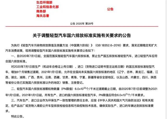 5月15日,據(jù)生態(tài)環(huán)境部網(wǎng)站消息,生態(tài)環(huán)境部等四部門聯(lián)合發(fā)布關(guān)于調(diào)整輕型汽車國六排放標(biāo)準(zhǔn)實施有關(guān)要求的公告,自2020年7月1日起,全國范圍實施輕型汽車國六排放標(biāo)準(zhǔn),禁止生產(chǎn)國五排放標(biāo)準(zhǔn)輕型汽車,進(jìn)口輕型汽車應(yīng)符合國六排放標(biāo)準(zhǔn)。