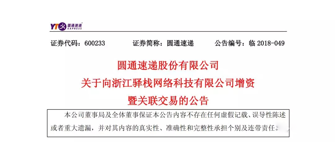 根據(jù)公告,圓通擬以自有資金4.5億元人民幣對浙江驛棧進行增資,其中1575萬元人民幣認(rèn)繳新增注冊資本,4.3425億元人民幣計入資本公積金。本次投資后,公司將持有浙江驛棧1575萬元人民幣注冊資本,持股占增資完成后比例為6.28%。