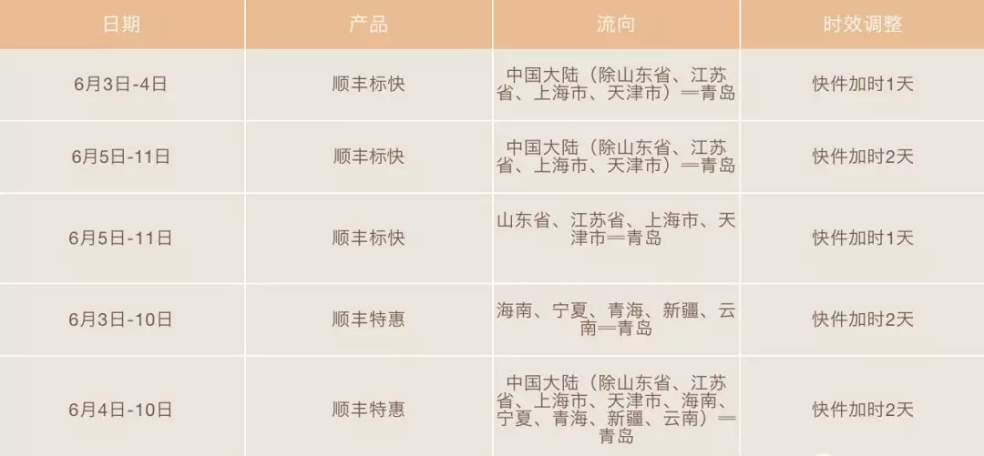 6月3日-11日,全網(wǎng)進(jìn)出青島流向的順豐次晨、即日、生鮮速配、部分醫(yī)藥冷運(yùn)等對溫度及時效要求較高的產(chǎn)品和冷藏冷凍件停收,物流普運(yùn)等重貨類產(chǎn)品停收(重貨快運(yùn)加時不停收)。